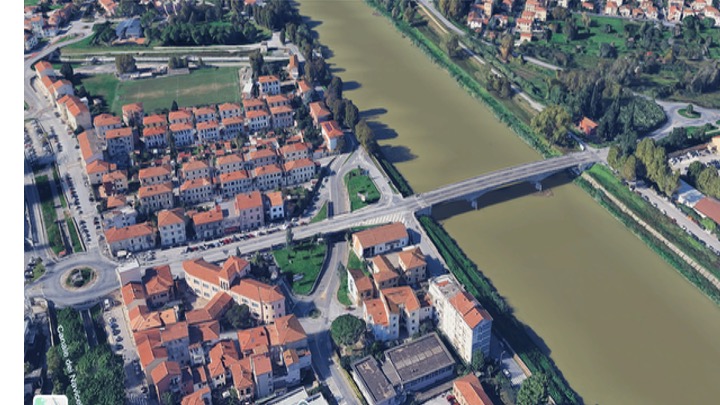 De mooiste figuur hebben we gemaakt waar we volgens de Ford-app eenvoudig, komende uit het centrum van Pisa vanaf de rechteroever van de Arno (rechtsonder op de afbeelding) eerst linksaf zouden moeten gaan, de brug over, en dan meteen weer naar rechts. Ford zat helemaal fout, want je kon de weg niet oversteken om linksaf te gaan. Geen nood, je kon gewoon naar rechts en na een paar honderd meter was er al een rotonde (die zijn in Italië speciaal gemaakt voor mensen die verkeerd zijn gereden en moeten omkeren) en we konden 180 graden draaien. Maar toen vergaten we vervolgens rechtsaf te gaan waar dat wel kon en moest. Geen nood: gewoon doorrijden en op de volgende rotonde – op de foto uiterst links – keren (“neem de vierde afslag”) en dan dat stuk weer over de brug afrijden tot we bij de rotonde kwamen die we daar al eerder hadden genomen (volg je het nog? Mooi figuurtje hè?), daar weer de vierde afslag en dan voor de derde keer de brug over en dan wel naar rechts gegaan. Hè, hè!